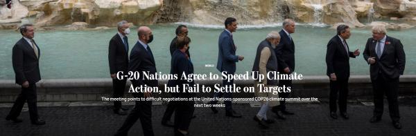 Podczas dwudniowego spotkania w Rzymie państwa G-20, do których należą Stany Zjednoczone, Indie i Chiny, starały się znaleźć konsensus co do tego, jak najlepiej przestrzegać porozumienia klimatycznego z Paryża z 2015 r., w którym wzywa się kraje do jak najszybszego rozpoczęcia redukcji emisji. w miarę możliwości i osiągnąć świat neutralny dla zmian klimatu do połowy stulecia. Gospodarki G-20 odpowiadają za około 75% światowych emisji. Ich szczyt w Rzymie poprzedza rozmowy klimatyczne ONZ znane jako COP26 w Glasgow w Szkocji, które rozpoczynają się w niedzielę wieczorem.