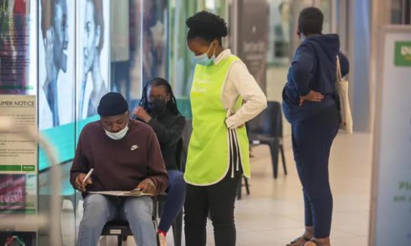 Ludzie czekają na szczepienie przeciwko Covid-19 w centrum handlowym w Johannesburgu