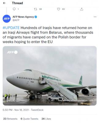 Setki Irakijczyków wróciło do domu w czwartek lotem Iraqi Airways z Białorusi, gdzie tysiące z nich koczowało od tygodni na polskiej granicy z nadzieją na przedostanie się do UE.