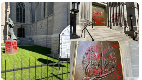 Zdjęcia udostępnione przez lokalnych reporterów pokazują hasła takie jak „Szatan tu mieszka”, „Biali supremacjoniści” i „Dzieci gwałciciele, LOL” napisane jaskrawoczerwoną farbą w sprayu na zewnątrz budynku katedry, na chodnikach i na podstawie pomnik św. Jana Pawła II, który odwiedził i przebywał w katedrze w 1993 roku.