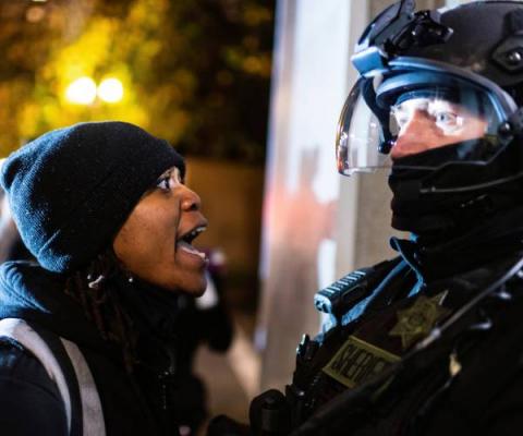Kobieta w konfrontacji z funkcjonariuszem policji przy południowym wejściu do Centrum SprawiedliwościProtest około 200 osób został ogłoszony zamieszkami po tym, jak protestujący zaczęli wybijać szyby, rzucać przedmiotami w policję i mówić o spaleniu Centrum Sprawiedliwości, podała KOIN TV.